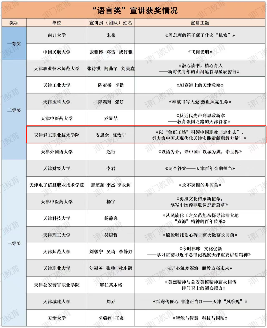 一直以来,我院深入贯彻落实党的二十大和二十届三中全会精神,认真学习贯彻习近平文化思想,全面落实全国教育大会精神和习近平总书记视察天津重要讲话精神,立足办学特色,发挥职业教育优势,提升中国职业教育影响力、感召力和塑造力。未来,学院将持续深化理论宣讲育人功能,强化理论根基、以赛促学增强宣讲本领,培育更多青年宣讲骨干,讲好轻工学院在奋进教育强国道路上的生动故事。