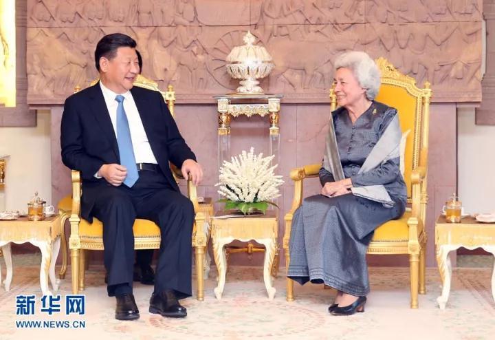 2016年10月13日,习近平在金边看望柬埔寨太后莫尼列。莫尼列太后特意请习近平在西哈努克太皇生前常坐的椅子上就座。新华社记者 姚大伟 摄