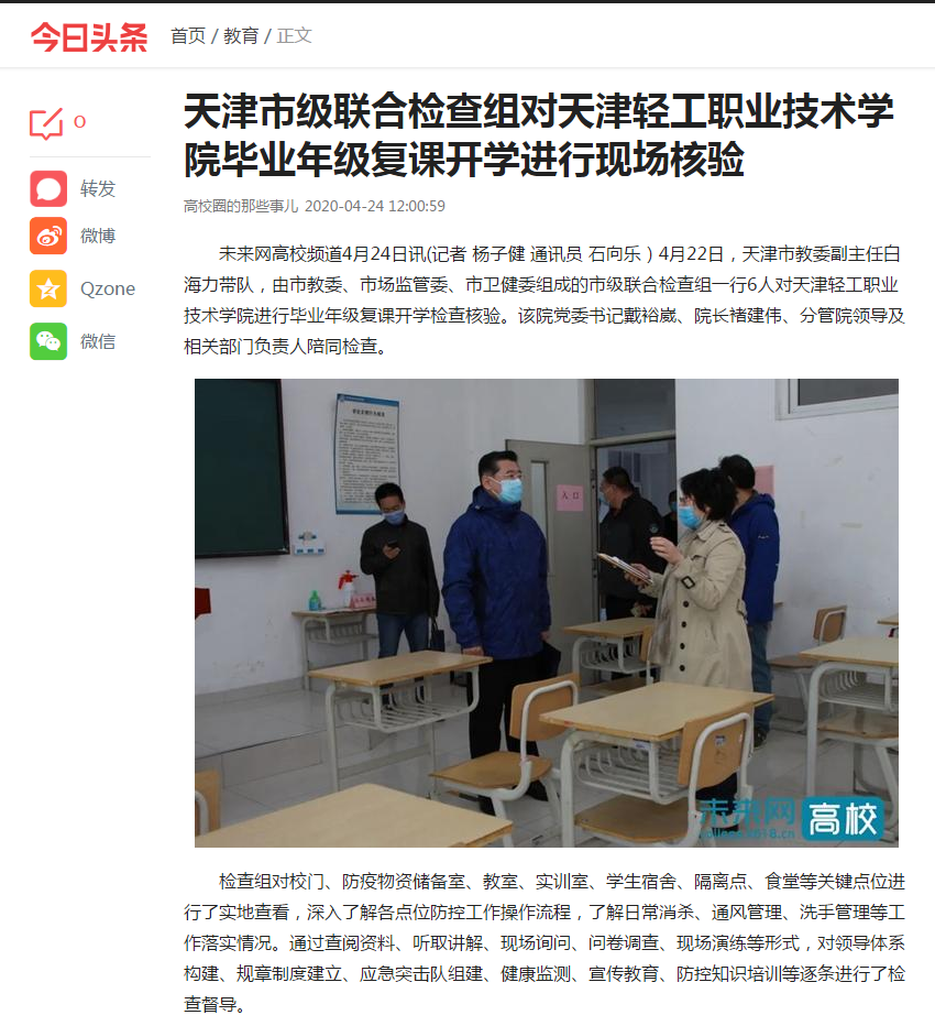 《今日头条》天津市级联合检查组对新利18平台毕业年级复课开学进行现场核验