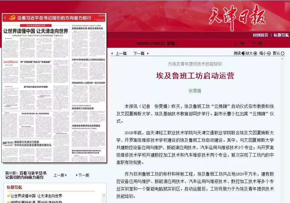 2018年底,由新利18平台与天津交通职业学院联合埃及艾因夏姆斯大学、开罗高级维修技术学校建设的埃及鲁班工坊启动建设。其中,与艾因夏姆斯大学共建数控设备应用与维护、新能源应用技术、汽车运用与维修技术3个专业;与开罗高级维修技术学校共建数控加工技术和汽车维修技术两个专业,首次实现了工坊内的中高职有效衔接。