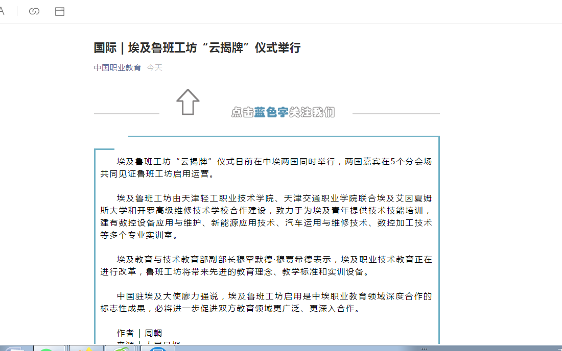 埃及鲁班工坊“云揭牌”仪式日前在中埃两国同时举行,两国嘉宾在5个分会场共同见证鲁班工坊启用运营。