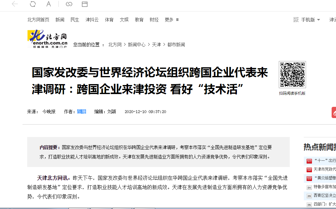北方网:国家发改委与世界经济论坛组织跨国企业代表来津调研:跨国企业来津投资 看好“技术活”