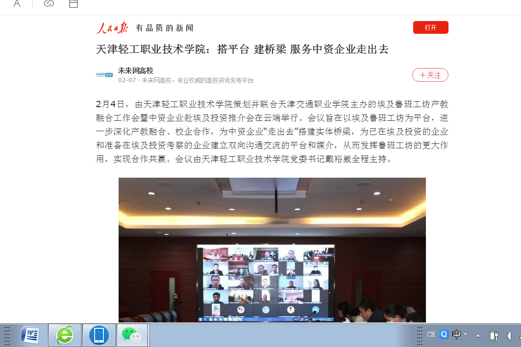 中国驻埃及使馆教科处公参王胜刚及庞博、经商处李运雷,天津市教委职教处处长李力,中埃·泰达苏伊士经贸合作区执行董事魏建青等23家企业共33人在线上参加会议;天津交通职业学院党委书记苏敬、副院长孙希月以及两所院校承担埃及鲁班工坊建设的相关处室和专业负责人一并参会。