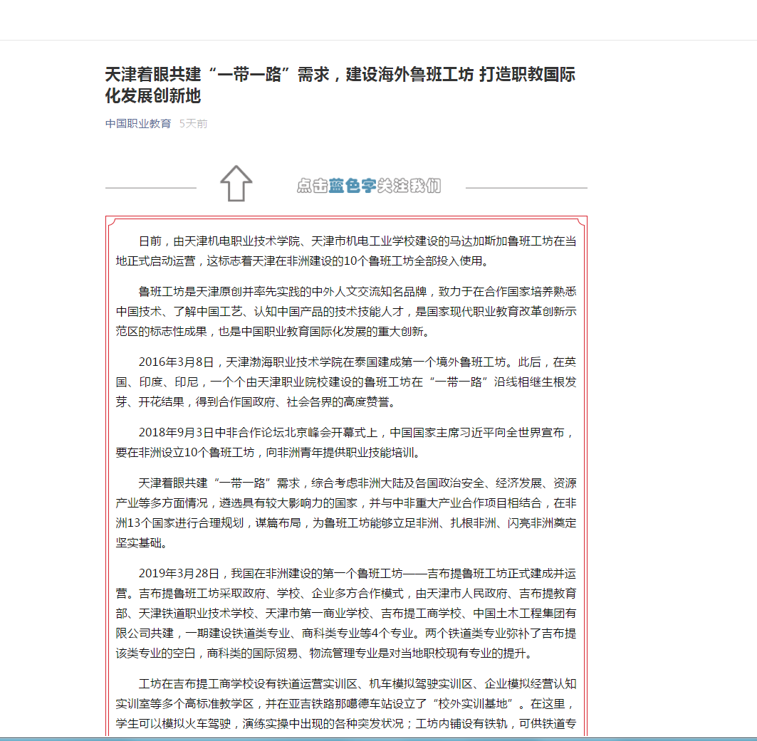 中国职业教育:天津着眼共建“一带一路”需求,建设海外鲁班工坊 打造职教国际化发展创新地