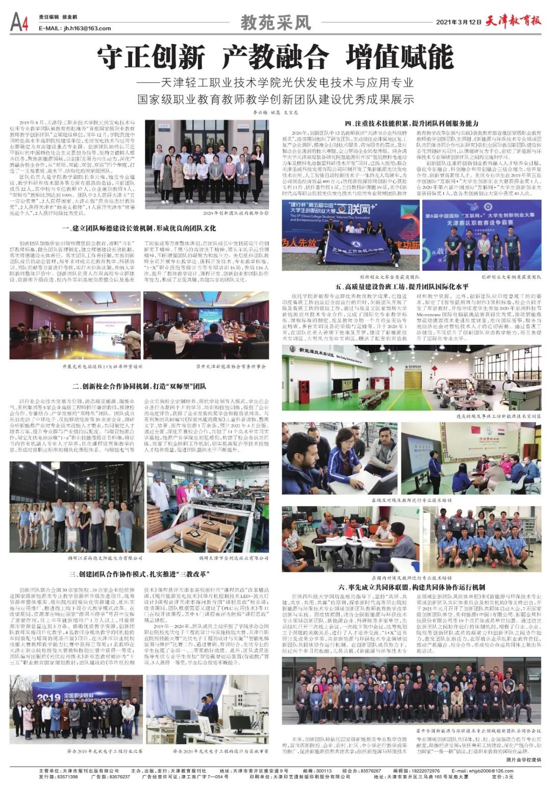 创新团队联合全国30余家院校、10余家企业继续推进国家级新能源类专业教学资源库升级改进项目,统筹资源库整体框架、组织院校间模块化资源建设、组织实施与应用推广,推进线上线下混合式教学模式改革。在疫情期间,资源库在响应国家“停课不停学”号召中发挥了重要作用,仅上半年就新增用户1万人以上,目前资源库资源总量达到3万条。借助优质教学资源,创新团队教师实施项目化教学,4名教师分模块教学的《机舱的车间装配与塔筒的现场吊装》项目,在天津市职业院校技能大赛教师教学能力比赛中获得三等奖;1名教师在天津市职业院校技能大赛教师技能比赛中获得一等奖;团队编写出版的《光伏应用技术》新形态教材被评为“十三五”职业教育国家规划教材;团队建设的《单片机控制技术》课程获评天津市高校新时代“课程思政”改革精品课,《现代能源发电技术》《单片机控制技术LED-流水灯设计》课程获评天津市海河教育园“课程思政”精品课;疫情期间,团队根据需要又建设了《PLC应用技术》等11门在线开放课程,其中5门课程被评为院级“课程思政”精品课程。