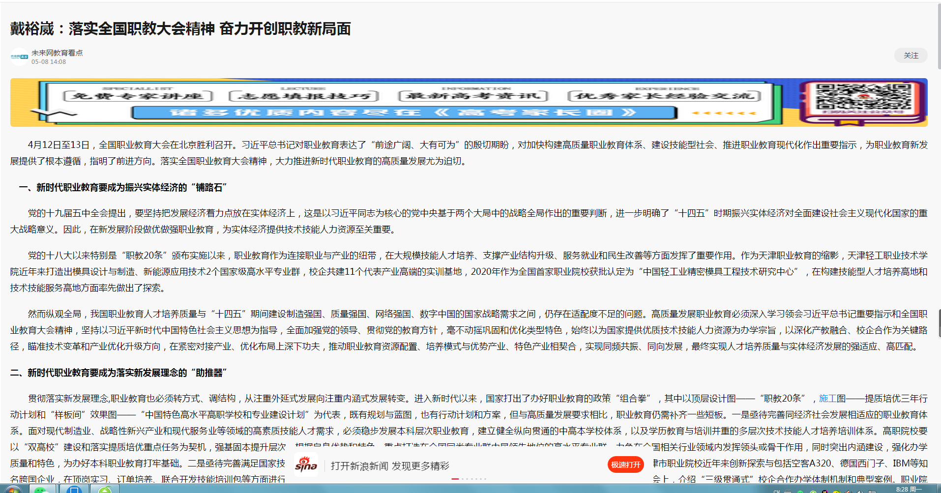 新浪网:戴裕崴:落实全国职教大会精神 奋力开创职教新局面