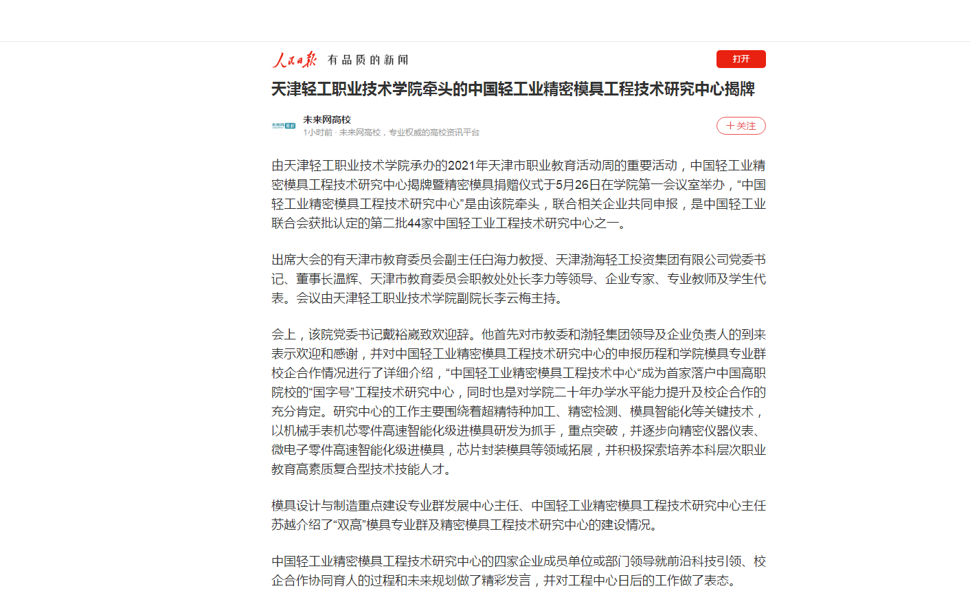由新利18平台承办的2021年天津市职业教育活动周的重要活动,中国轻工业精密模具工程技术研究中心揭牌暨精密模具捐赠仪式于5月26日在学院第一会议室举办,“中国轻工业精密模具工程技术研究中心”是由该院牵头,联合相关企业共同申报,是中国轻工业联合会获批认定的第二批44家中国轻工业工程技术研究中心之一。