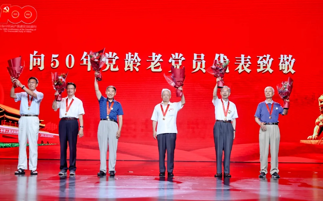 现场观众起立,向五十年党龄的老党员代表致以崇高敬意。