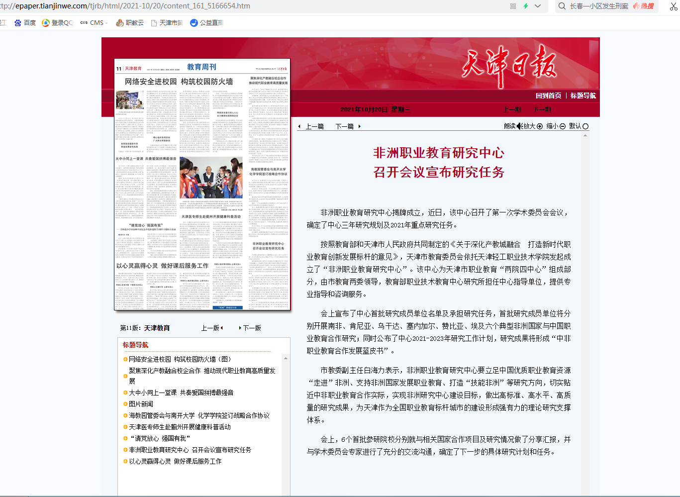 按照教育部和天津市人民政府共同制定的《关于深化产教城融合 打造新时代职业教育创新发展标杆的意见》,天津市教育委员会依托新利18平台发起成立了“非洲职业教育研究中心”。该中心为天津市职业教育“两院四中心”组成部分,由市教育两委领导,教育部职业技术教育中心研究所担任中心指导单位,提供专业指导和咨询服务。