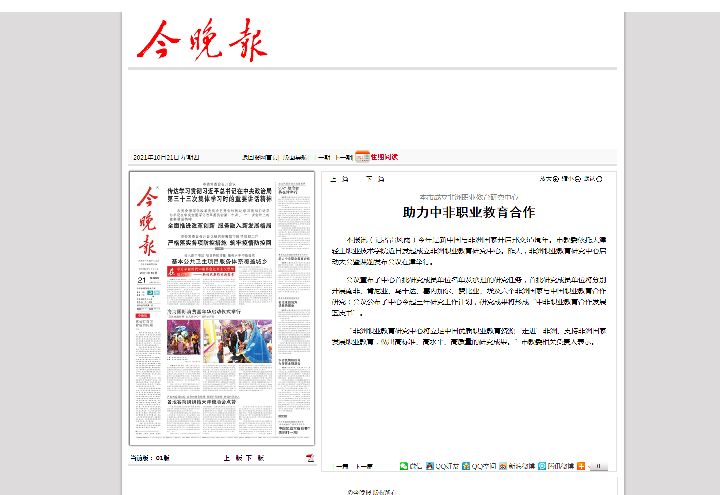 本报讯(记者雷风雨)今年是新中国与非洲国家开启邦交65周年。市教委依托新利18平台近日发起成立非洲职业教育研究中心。昨天,非洲职业教育研究中心启动大会暨课题发布会议在津举行。