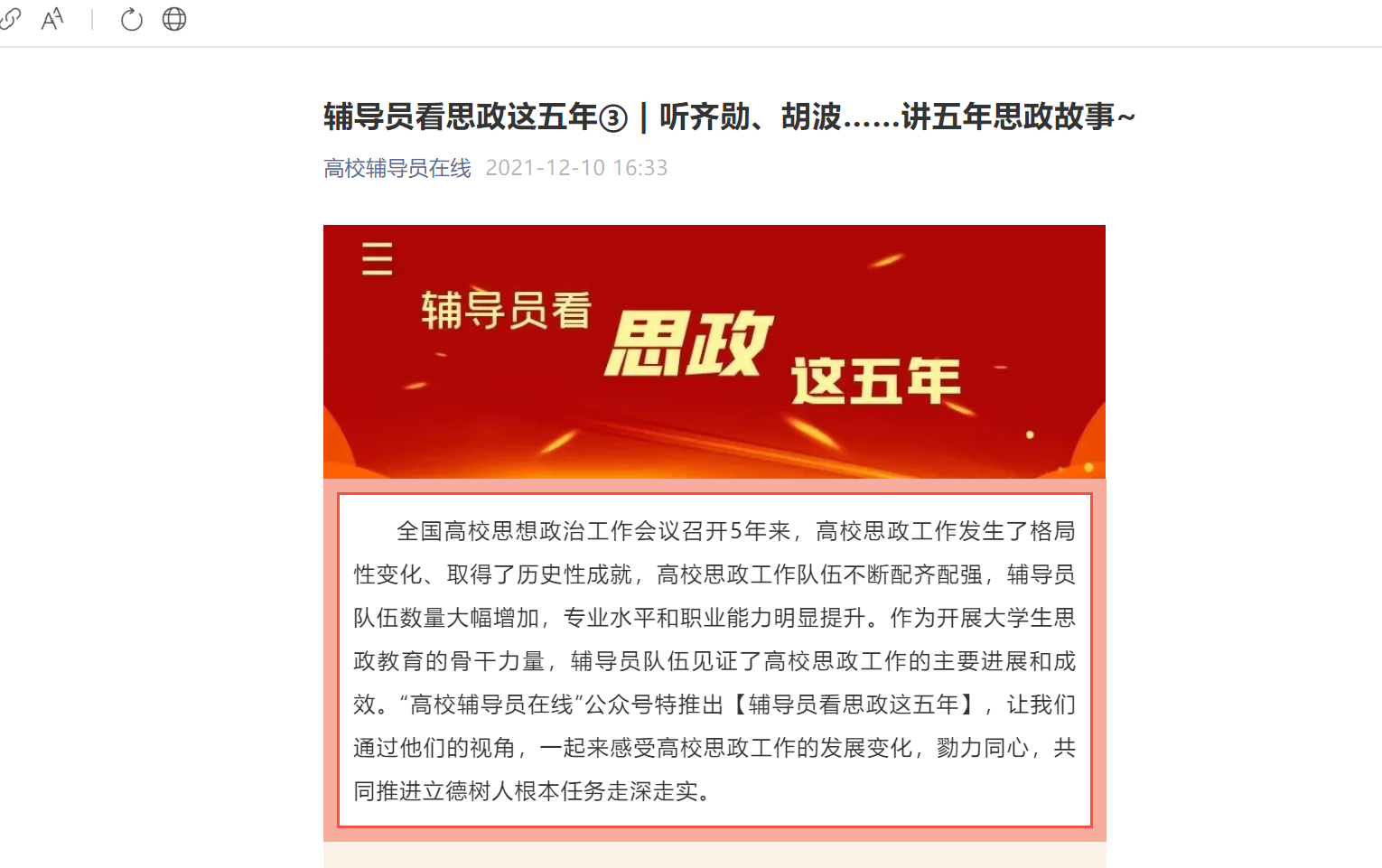 全国高校思想政治工作会议召开5年来,高校思政工作发生了格局性变化、取得了历史性成就,高校思政工作队伍不断配齐配强,辅导员队伍数量大幅增加,专业水平和职业能力明显提升。作为开展大学生思政教育的骨干力量,辅导员队伍见证了高校思政工作的主要进展和成效。“高校辅导员在线”公众号特推出【辅导员看思政这五年】,让我们通过他们的视角,一起来感受高校思政工作的发展变化,勠力同心,共同推进立德树人根本任务走深走实。