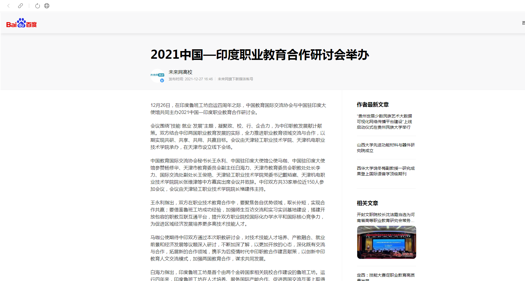 百度:2021中国—印度职业教育合作研讨会举办