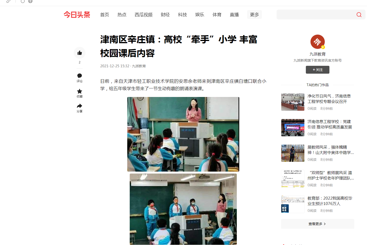 今日头条:津南区辛庄镇:高校“牵手”小学 丰富校园课后内容