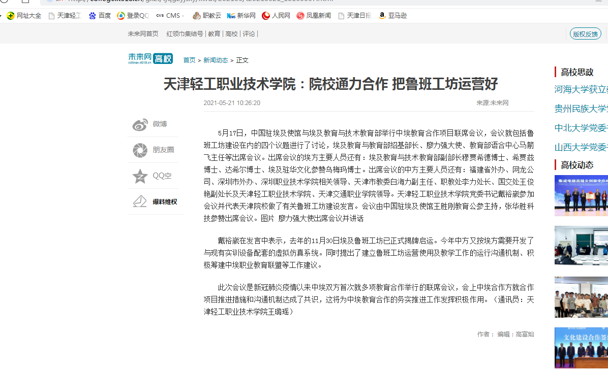 此次会议是新冠肺炎疫情以来中埃双方首次就多项教育合作举行的联席会议,会上中埃合作方就合作项目推进措施和沟通机制达成了共识,这将为中埃教育合作的务实推进工作发挥积极作用。(通讯员:新利18平台王璐瑶)