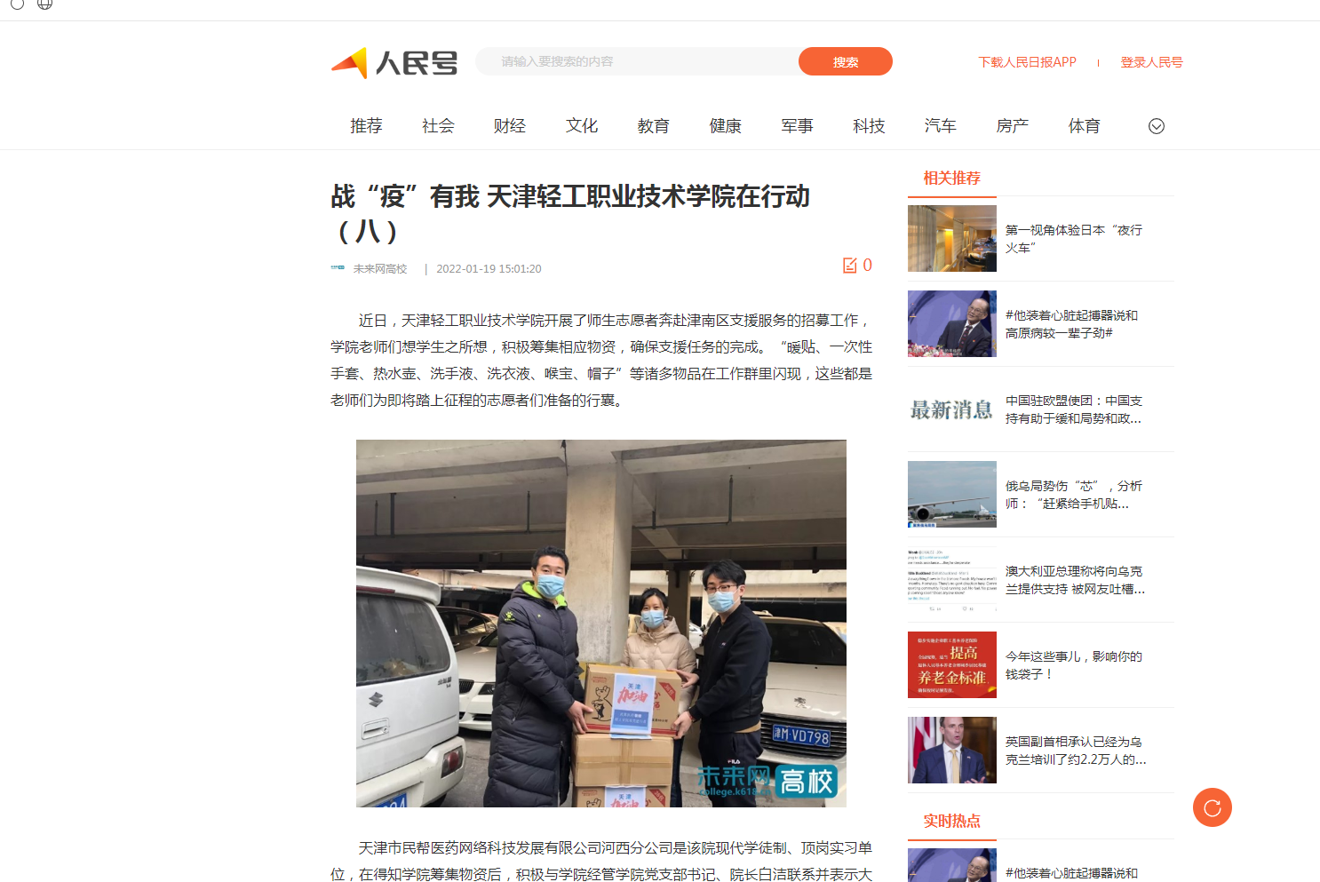 天津市民帮医药网络科技发展有限公司河西分公司是该院现代学徒制、顶岗实习单位,在得知学院筹集物资后,积极与学院经管学院党支部书记、院长白洁联系并表示大力支持学院支援志愿者抗击疫情,捐赠暖贴3箱(每箱360片),合计1080片;暖足贴1箱(每箱480对)。学院委派经济管理学院党支部书记、院长白洁,艺术工程学院副书记刘畅二位领导到企业接受捐赠并代表学院表达了对校企合作企业的敬意和感谢。据了解,疫情发生后,该企业立即发布了《疫情防控应急通报》和《疫情防控期间企业承诺书》,学院顶岗实习的25名学生均在该企业得到了切合实际的安置,采取了一系列暖心聚力的举措,得到了学院实习学生的高度认可。