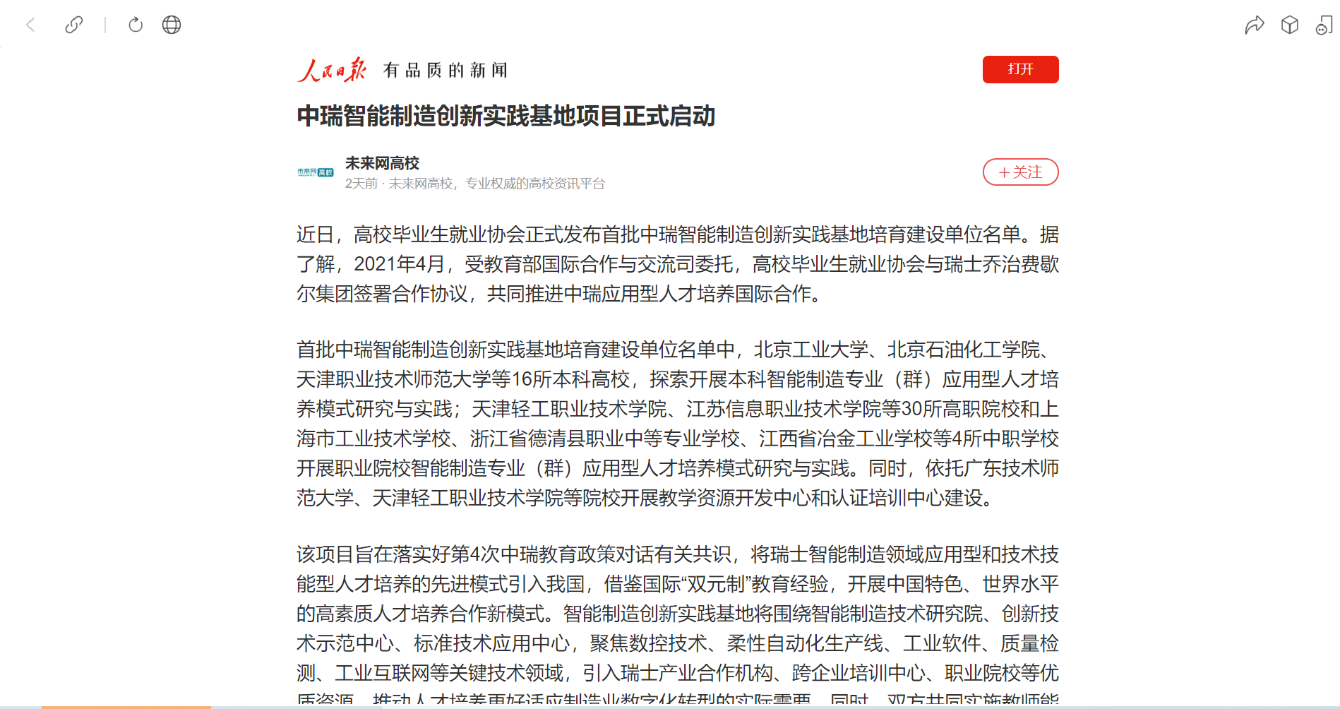 该项目旨在落实好第4次中瑞教育政策对话有关共识,将瑞士智能制造领域应用型和技术技能型人才培养的先进模式引入我国,借鉴国际“双元制”教育经验,开展中国特色、世界水平的高素质人才培养合作新模式。智能制造创新实践基地将围绕智能制造技术研究院、创新技术示范中心、标准技术应用中心,聚焦数控技术、柔性自动化生产线、工业软件、质量检测、工业互联网等关键技术领域,引入瑞士产业合作机构、跨企业培训中心、职业院校等优质资源,推动人才培养更好适应制造业数字化转型的实际需要。同时,双方共同实施教师能力提升计划、教学资源库建设、开发认证考评体系、促进国际合作与交流、开展课题研究和就业服务等建设任务。