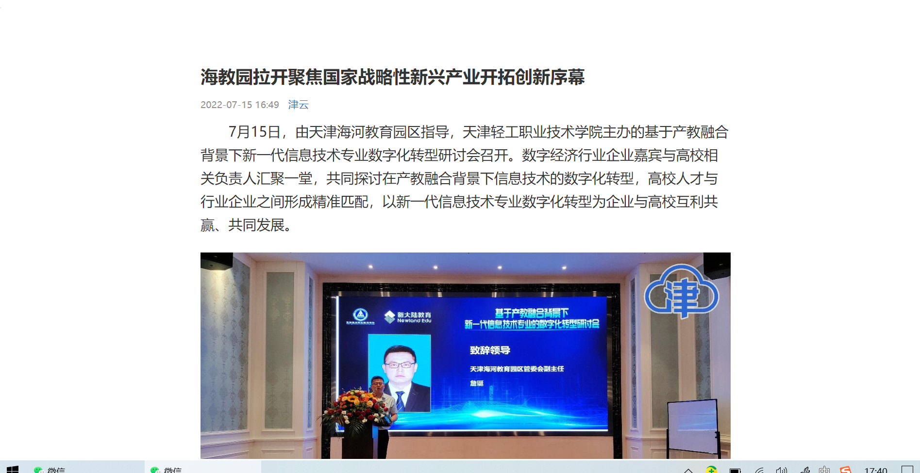 7月15日,由天津海河教育园区指导,新利18平台主办的基于产教融合背景下新一代信息技术专业数字化转型研讨会召开。数字经济行业企业嘉宾与高校相关负责人汇聚一堂,共同探讨在产教融合背景下信息技术的数字化转型,高校人才与行业企业之间形成精准匹配,以新一代信息技术专业数字化转型为企业与高校互利共赢、共同发展。