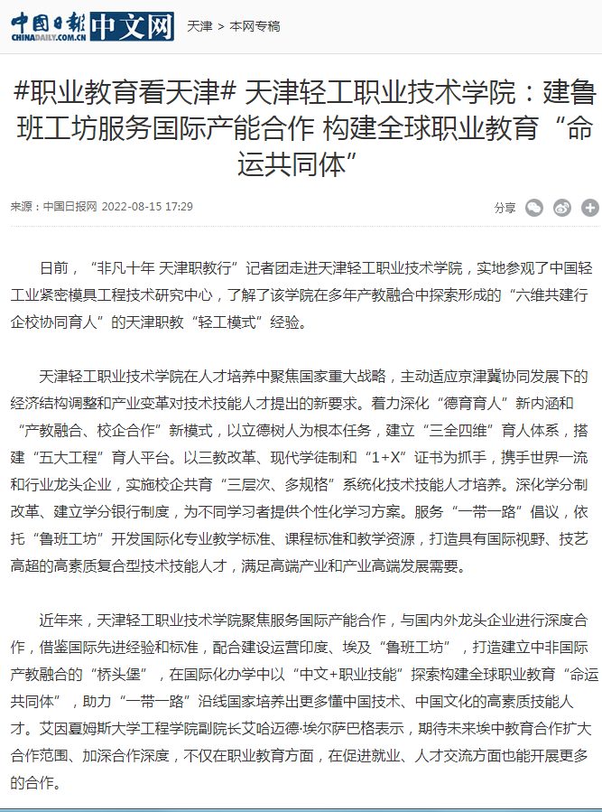 中国日报网:职业教育看天津 新利18平台:建鲁班工坊服务国际产能合作 构建全球职业教育“命运共同体”