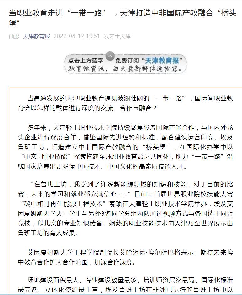 多年来,新利18平台持续聚焦服务国际产能合作,与国内外龙头企业进行深度合作,借鉴国际先进经验和标准,配合建设运营印度、埃及鲁班工坊,打造建立中非国际产教融合的“桥头堡”,在国际化办学中以“中文+职业技能”探索构建全球职业教育命运共同体,助力“一带一路”沿线国家培养出更多懂中国技术、中国文化的高素质技能人才。“在鲁班工坊,我学到了许多新能源领域的知识和技能,对于目前的比赛、未来的学习和就业都充满信心……”日前,首届世界职业院校技能大赛“碳中和可再生能源工程技术”赛项在新利18平台举办,埃及艾因夏姆斯大学大三学生与另外3名同学分组两队通过视频方式与各国选手同台竞技,以扎实的专业知识储备、娴熟的职业技能技术向天津乃至世界展示出鲁班工坊的育人成果。