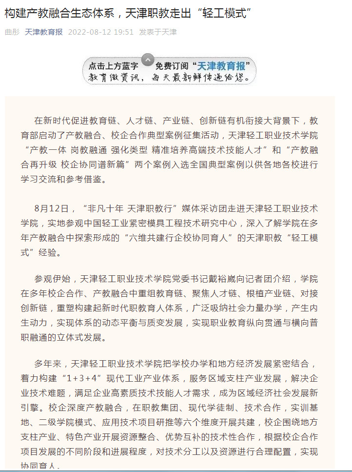 | 天津教育报:构建产教融合生态体系,天津职教走出“轻工模式” |