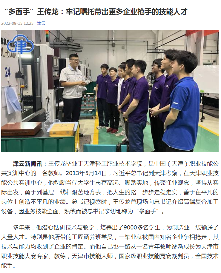 “现代化制造业需要高素质的产业技能人才。作为一名青年教师,我一定牢记总书记的嘱托,不仅自己要做‘多面手’,更要做好传帮带工作,努力培养更多高水平、高技能技术人才,为他们实现人生价值插上飞翔的翅膀。”王传龙说。(津云新闻记者段玮)