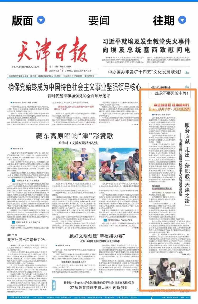 近年来,天津职业教育在支撑产业转型升级、助力京津冀职教协同发展、推进巩固扩展脱贫攻坚成果与乡村振兴有效衔接等方面作出重要服务贡献。近5年,我市累计培养合格毕业生超26万人,留在本地就业人数约占58%,累计开展技术技能培训约417万人,技术服务产生的经济效益2.2亿元。依托国家现代职业教育改革创新示范区资源优势,我市聚焦质量发展、内涵发展、创新发展,深度对接产业升级和民生需求,主动服务国家重大发展战略,服务“一基地三区”城市定位,瞄准“五个现代化天津”建设,目前已走出一条包含区域系统援建、品牌整体输出、专业结对共建、师资轮岗培训、学生定制培养5大模式的职教帮扶“天津之路”。