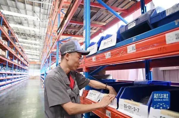▲从天津机电职业技术学院毕业的党磊在天津中车唐车轨道车辆有限公司的货架前进行检查工作