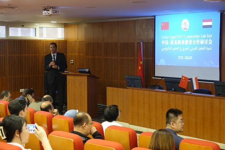 四名埃方专家围绕《关于BTEC职业教育国际标准》《做中学——艾因夏姆斯大学鲁班工坊EPIP》《贝尼苏韦夫技术大学办学优势、校企融合及国际合作项目》《技术教育改革策略》进行专题发言。