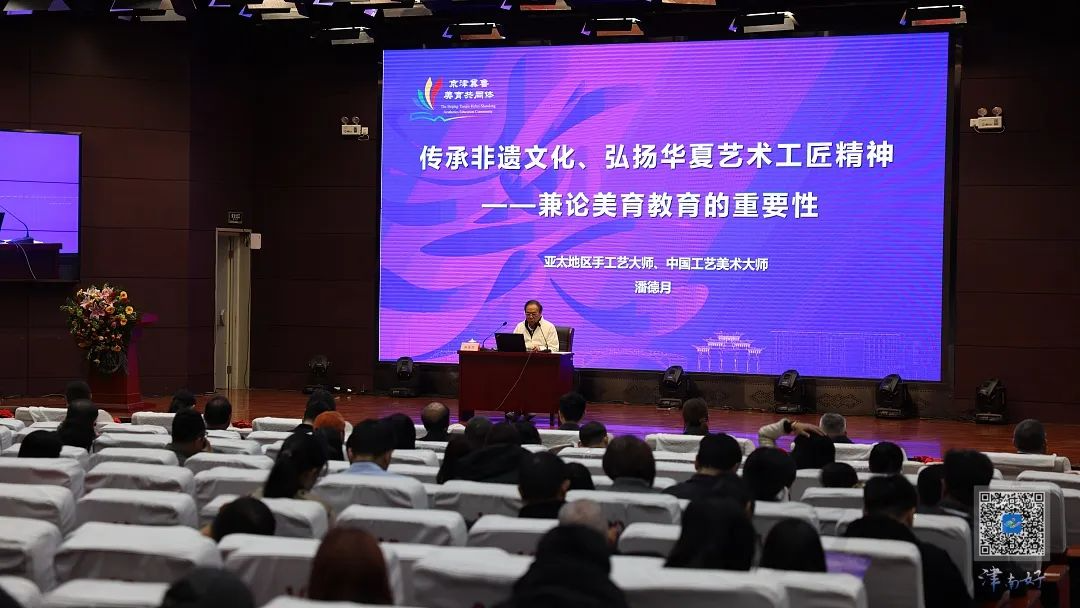 亚太地区手工艺大师潘德月以《传承非遗文化、弘扬华夏艺术工匠精神——兼论美育教育的重要性》为题作主旨报告。来自墨子研究中心、天津财经大学、济宁职业技术学院的专家学者深入探讨了如何全面提升文化理解、审美感知、艺术表现、创意实践等核心素养,聚焦艺术与科技的融合、创新教学方法的探索、艺术教育的终身化发展等课题,为深化美育改革建言献智。