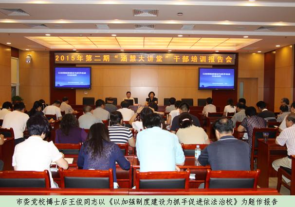 为深入学习十八届四中全会精神,落实“三严三实”专题教育的要求,切实推进依法治校工作的开展,加快提高我院中层干部的思维、决策、履职和身心健康的能力与水平,学院党委于2015年9月2日组织举办了“涵慧大讲堂”第二期干部培训报告会。这期报告会的主题是“践行三严三实要求,提升中层干部的身心修养水平,促进依法治校建设”。在上午的报告会上,市委党校王俊博士后以《以加强制度建设为抓手促进依法治校》为题作了报告。王教授以深入浅出的方式分析了新形势下,依法治校的重要意义,报告内容详实,观点鲜明,对于深刻领会十八届四中全会精神,树立依法治校的观念,推动学院各项工作在法治和制度的轨道内持续健康发展提供了重要的理论依据。市委党校王健博士后在下午的报告会以《干部心理压力的调适与修身修心》为题作了报告。王教授从领导干部心理压力的主要来源入手,运用通俗易懂的语言、鲜活生动的案例,将深奥的理论知识与现实生活中的实例相结合,对当前领导干部存在的心理现状作了独到的分析,并就在实际工作中如何排解压力、调节心理、保持积极健康的心态作了详细的阐述,为领导干部今后能够以乐观向上、积极健康的心态开展工作起到了重要作用。两位教授的报告引发了听众的共鸣。