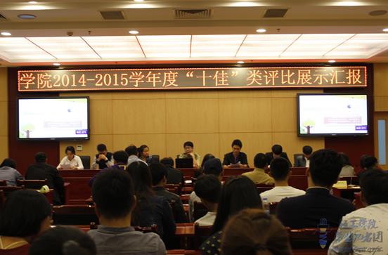 为展现当代大学生风采、树立典型,鼓励学生刻苦学习、奋发图强,近日我院分别举行了2014-2015学年度“十佳”类和“标兵”类评比展示汇报工作。学院评优工作评委由主管院领导、学工部、团委、督察办、教务处及4个二级学院组成,全程参与“十佳”和“标兵”类的评比工作。
