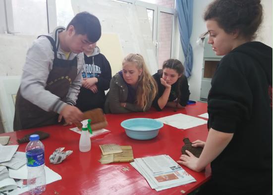 参观完毕后,刘院长带领留学生们进入了文物鉴定与修复专业刘宏杰老师的书画装裱课堂。在课堂上,刘老师详细给留学生们讲解了传统中国书画装裱的用具和工序,并现场演示。为了让英国师生们留下更深刻的印象,刘老师和她的学生们将留学生分成组,发给他们工具,手把手带领他们体验书画装裱的制作流程。装裱体验完毕后,学生们兴奋地与各自的“作品”合影留念。