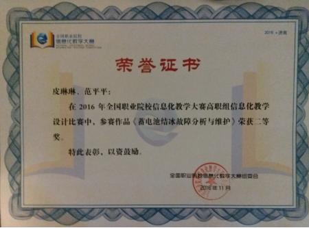2016年全国职业院校信息化教学大赛近日顺利落下帷幕,我院皮琳琳、范平平团队设计的《蓄电池结冰故障分析与维护》在全国信息化教学大赛高职组信息化教学设计比赛中喜获二等奖。