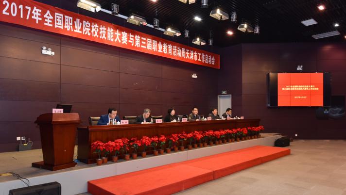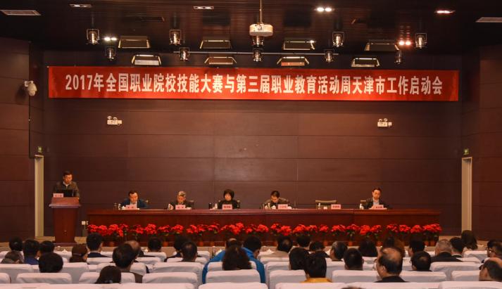 2017年全国职业院校技能大赛与第三届职业教育活动周天津市工作启动会在轻工学院召开。出席会议的领导有市教委副主任吕景泉、职教中心主任孟志咸、教研室主任米靖,以及职业技术教育中心相关科室负责同志和大赛办公室工作人员,会议由高职高专处处长杨荣敏主持。来自天津市各区县教育局领导和各职业院校的负责人出席会议。