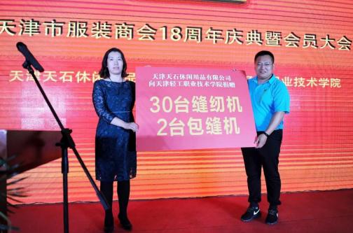 近日,天津市服装商会十八周年庆典如期举行。商会会长、常务副会长、副会长单位等100余家代表参加了本次活动,我院院长戴裕崴以及我院艺术工程学院院长刘建伟出席本次活动。戴裕崴院长在庆典活动期间为天津天石休闲用品有限公司、天津市飞尼克斯实业发展有限公司、天津市芭而蒂服饰有限公司、天津市应大服饰有限公司、天津市雅泉工贸有限公司、天津奔骜服饰有限公司6家校企合作的服装企业实训单位授牌。刘建伟院长接受了天津天石休闲用品有限公司赠予的30台缝纫机和2台包缝机。