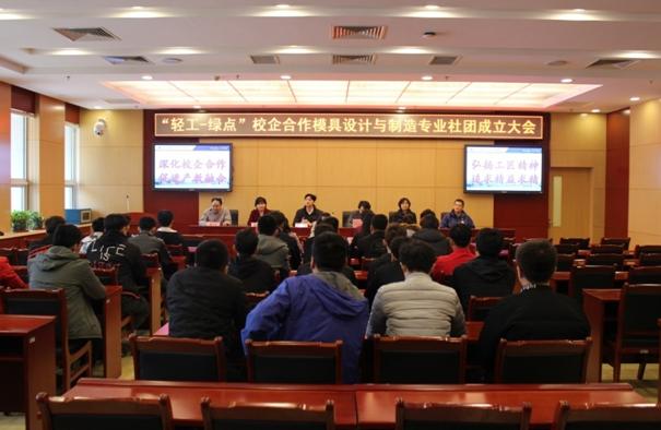为了贯彻全国职业教育工作会议和全国高校思政工作会议精神,落实《国务院关于加快发展现代职业教育的决定》,深化产教融合,创新校企合作模式,进一步培育和践行工匠精神,服务京津冀协同发展,结合我院模具设计与制造专业的办学特色和模具行业的发展现状,经我院领导与捷普绿点天津精密电子有限公司相关领导研究决定,在机械工程学院成立“轻工-绿点”校企合作模具设计与制造专业社团。社团经过前期的筹划和成员的选拔考试,已完成相关的成立准备工作,近日在我院第二会议室举行了社团的成立大会,与会的领导有副院长李云梅,机械工程学院院长周树银、副院长李玉庆,捷普绿点模具事业群处长柯龙杰、副厂长李丽娜及社团相关指导老师等,社团全体成员参加了本次会议,会议由机械工程学院副院长李玉庆主持。