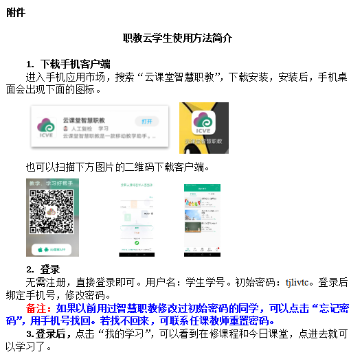 请各位同学关注国家级专业教学资源库、职教云在线课程、智慧树网络课程、超星网络课程等优质教学资源,及时完成身份认证,进行实名注册;熟悉其中各项学习功能;及时关注班级QQ群,任课教师会加入班级群中,通过班级群及时了解教师的授课安排,并按照教师要求完成学习任务。学院将为学生推荐所需的电子资料、电子文献等网上资源,各任课教师在课程开课前会向学生推荐优秀的电子参考书和网络课程资源等。