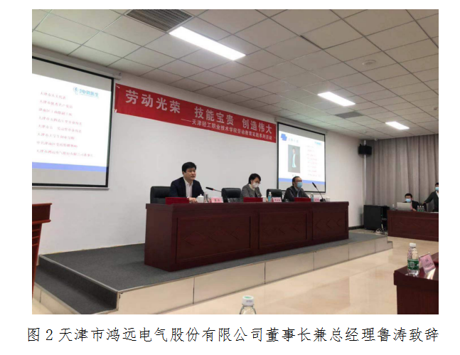 会议第一项,天津市鸿远电气股份有限公司董事长兼总经理鲁涛致辞发言。鲁涛在讲话中表示鸿远电气股份有限公司与新利18平台长期合作,互利共赢,共同深化校企合作为社会培养高技能专业人才,推动校企合作再上新高度。未来,鸿远电气将会完成转型升级,着力成为安全用电领军企业。