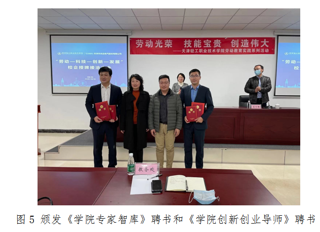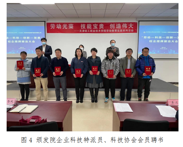 会议第三项,天津轻工职业技术学院副院长李子铮宣读《学院企业科技特派员章程及聘任决定》《学院科技协会会员章程及聘任决定》,并指出特派员要履行参与企业研发,解决企业生产和新产品开发中的技术问题,提升企业产品竞争力;推动企业完善以知识产权为核心的知识、技术管理制度;发挥典型示范效应,加快提升产学研结合的层次和水平;协助企业策划申报各级科技项目,并与企业联合承担等职责。随后,校企双方领导为学院企业科技特派员、科技协会会员代表颁发聘书。