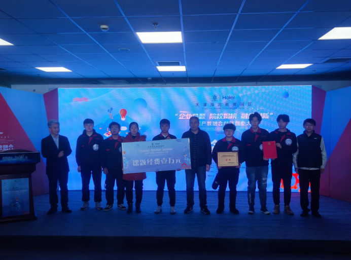 经过激烈比拼,1个项目获得大赛金奖,2个项目获得银奖,4个项目获得铜奖,其他6个项目获得优秀奖。我院《轴套剥离解决方案》项目获得金奖,《板料扫描自动化检测》项目获得优秀奖。大赛现场海教园社发局对获奖项目给予了纵向课题和壹万元经费支持,天津海尔洗涤电气有限公司提供了实物奖励和创业孵化、成果转化支持。大赛现场海尔衣联网研究院与金奖项目负责人签署落地意向书。