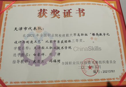 6月18日,2021年全国职业院校技能大赛高职组“模具数字化设计与制造工艺”赛项在济南职业技术学院落下帷幕。机械工程学院代表天津市参加了此项比赛,获得了三等奖。