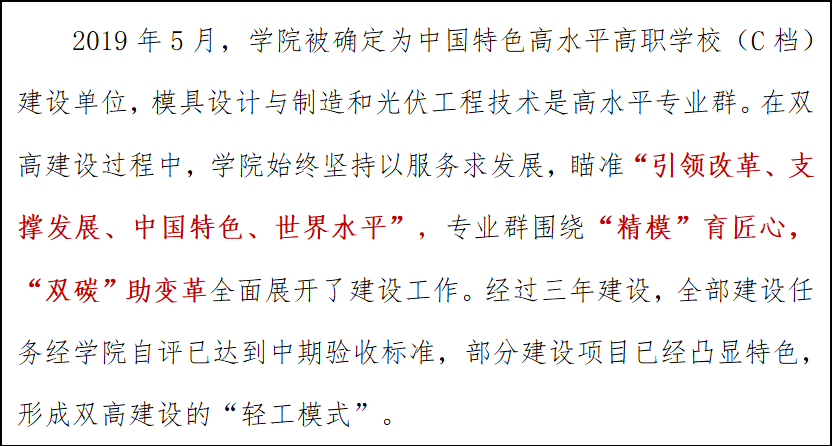 学院双高建设坚持成果导向,做到夯基础、高起点、稳步走、重成效,在全面推进中,突出重点、攻克难点、打通堵点、形成亮点,在职教创新改革中成为“破冰船”和走向世界职教舞台的“先行者”。