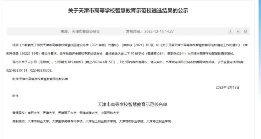 经学校自评申报和专家论证审核,2022年12月15日天津市教育委员会公示,我院被认定为天津市高等学校智慧教育示范校。