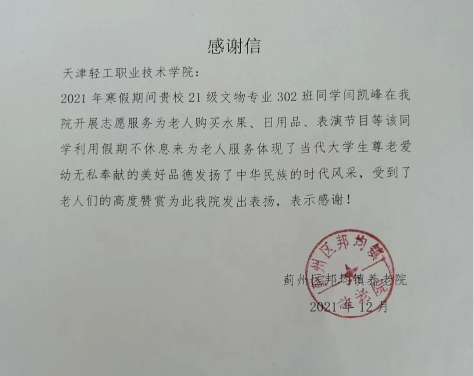 在寒暑假期间,闫凯峰坚持在家乡的敬老院进行义务服务,获得了老人们的一致好评,敬老院还写给他一封感谢信。此外,他还参与线上低碳节能志愿者、抗灾减灾志愿者的培训,目前已累计100多小时,随时准备为社会奉献自己的一份力量。