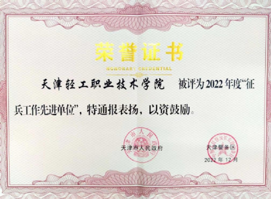2022年全年共37名学生实现了参军入伍的梦想,其中毕业生28人,毕业生比例在河北区荣列前茅,荣获“2022年度天津市征兵工作先进单位”称号。