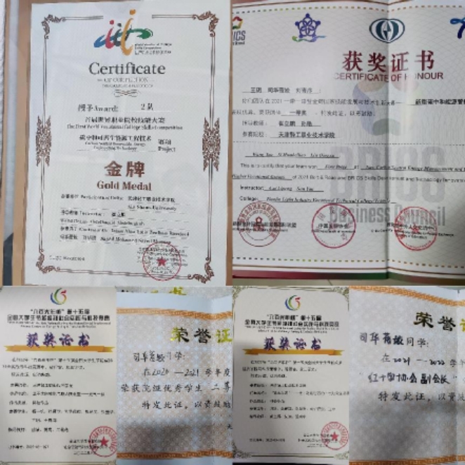 司华蓓姣在完成课程之余,为了充实大学生活,提升个人技能素养,积极参加各类技能比赛,并取得优异成绩。2021年11月获得“一带一路暨金砖国家技能发展与技术创新大赛”团体一等奖,2022年4月获得风光互补安装与调试天津市选拔赛第一名,2022年8月获得“首届世界职业院校技能大赛”碳中和可再生能源赛项金奖,2022年8月获得“六百光年杯”第十五届全国大学生节能减排社会实践与科技竞赛三等奖两项,2022年11月获得第三届“海河工匠杯”技能大赛——可再生能源赛项第三名。