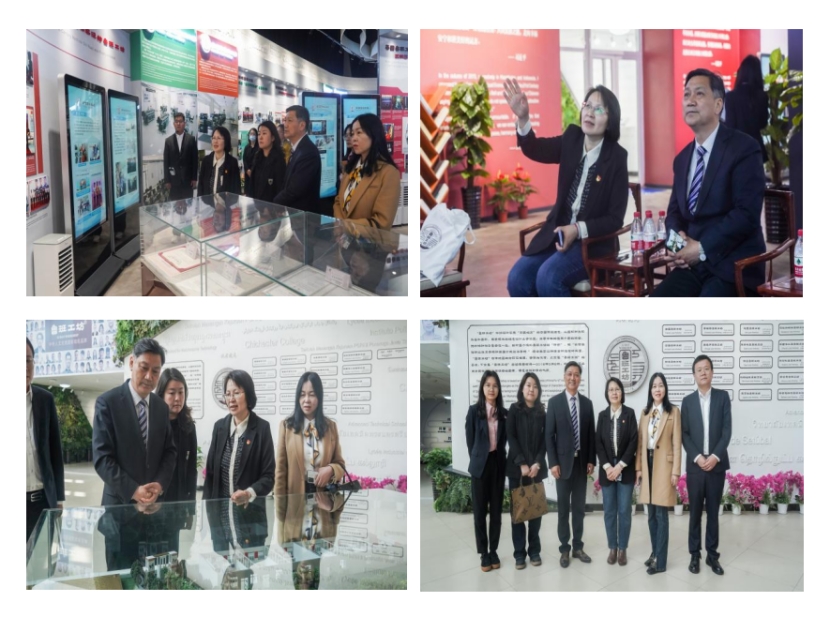 随后,院长李云梅陪同湖南三一工业职业技术学院一行参观了鲁班工坊建设·体验馆,介绍了鲁班工坊的整体建设历程、各国鲁班工坊及我院牵头建设的印度和埃及鲁班工坊的具体情况及标志性成果等内容。