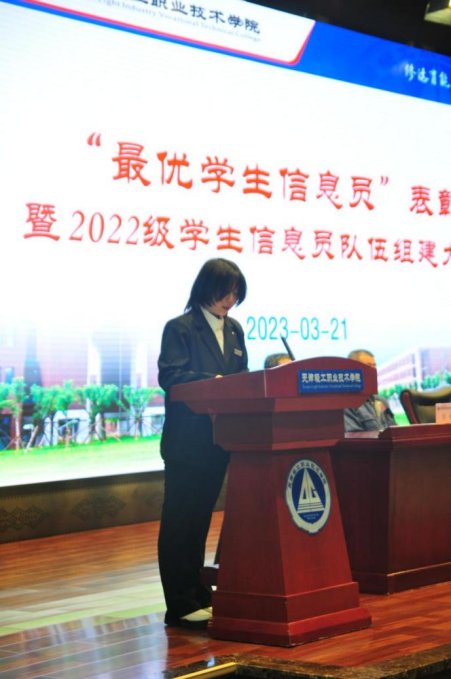 在2022级学生信息员队伍组建仪式上,103名新信息员全体起立,完成佩戴胸牌仪式。2022级工业产品质量检测技术1班陶馨蕊作为新学生信息员代表发言,她表示将饱含工作热情,创新工作方式方法,圆满完成各项工作。