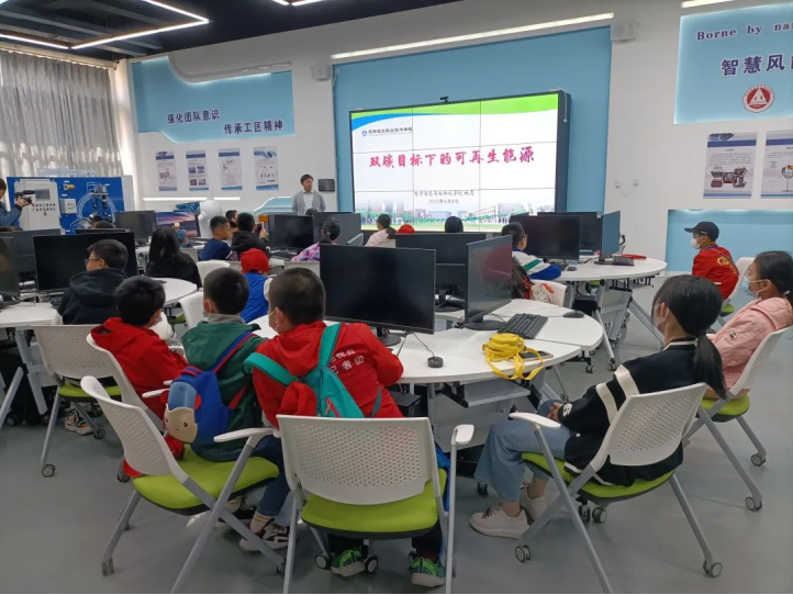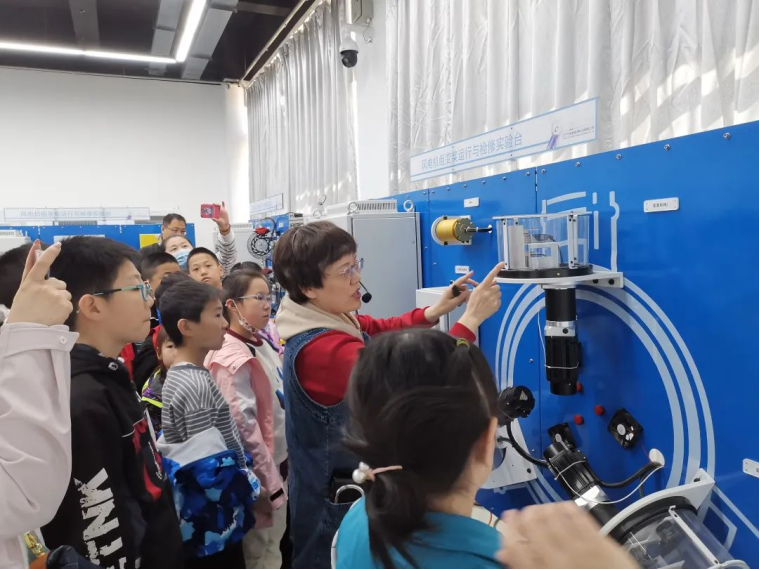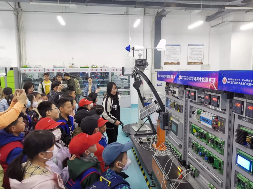 小记者们首先参观了风电机组控制实训室,电子信息与自动化学院院长姚嵩给大家带来了一场精彩的主题讲座——《双碳目标下的可再生能源》,用通俗易懂的方式让小记者们对“双碳”“可再生能源”等有了深刻的认识。随后李良君老师利用风电实训室的设备现身说法,讲解了风力发电的原理,通过近距离的演示,小记者们对于风力发电有了进一步的了解。首届世界职业院校技能大赛——碳中和可再生能源工程技术赛项金牌获得者司华蓓姣同学给小记者们展示了风光互补系统的运行,小记者们专心致志地聆听讲解,目不转睛地观察设备操作步骤。新能源专业群的老师们还准备了新能源手工小制作,小记者们积极动手参与,最后还给小记者们赠送了新能源专业群教师主编的科普读物——《探索风能的奥秘》,希望他们回去可以和身边的同学一起继续探索新能源的奥秘。