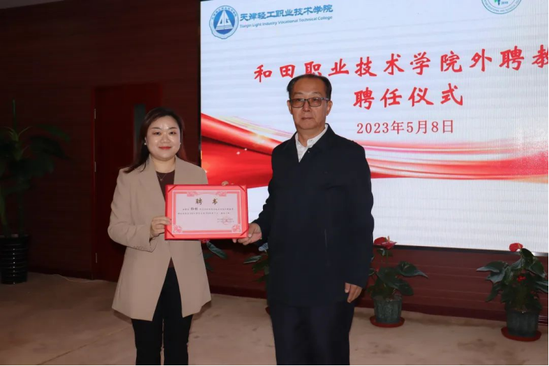 李云梅院长为和田职院教师韩沈平、我院挂职干部田洪军颁发天津市教学成果奖证书;和田职业技术学院副院长耿铁军为我院教师杨槟、张津辅等教师颁发兼职教师聘书,并希望两校教师联合教研,协作发展,共同推动三教改革。
